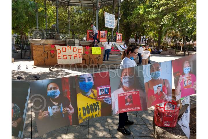 CULIACÁN, SINALOA, 10MAYO2020.- Madres con hijos desaparecidos se manifestaron en esta ciudad para exigir que el gobierno estatal continúe con la búsqueda de personas privadas de la libertad. Las madres que aglutinan el colectivo de búsqueda Sabuesos Guerreras, dijeron que con todo y pandemia ellas no han detenido el trabajo de localización de desaparecidos. Las mujeres colocaron fotografías y carteles en la plazuela Obregón, para exigir la aparición con vida de sus hijos. FOTO: JUAN CARLOS CRUZ/CUARTOSCURO.COM
