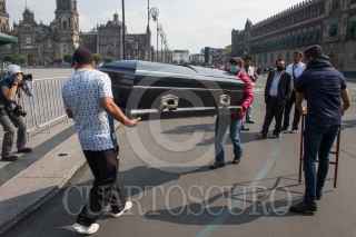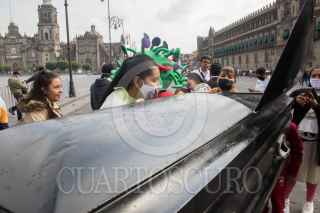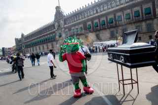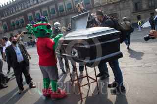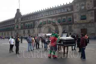 CIUDAD DE MÉXICO, 11MAYO2020.- Integrantes de la Comisión Internacional de los Derechos Humanos de Nuevo León acudieron con una ataúd y una botarga de Covid-19 frente a Palacio Nacional para denunciar que miles de personas que obtuvieron un amparo en sus procesos judiciales, aún continúan en la cárcel, con esto ponen en riesgo la vida de muchas personas que bien podrían llevar su proceso en libertad con las reservas de ley y las autoridades prefieren mantenerlos en los centros penitenciarios, muchos de ellos focos de infección de Coronavirus. FOTO: MOISÉS PABLO/CUARTOSCURO.COM