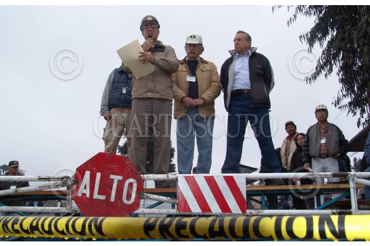 SAN JUAN DE SABINAS, COAHUILA 24FEBRERO2006.- El gerente de la mina 8, Rubén Escudero y el secretario del Trabajo, Francisco Javier Salazar, durante la conferencia de prensa que dieron por la mañana a los medios de comunicación e la que informaron sobre los avances de los trabajos de rescate de los mineros que se encuentran en el interior de la mina Pasta de Conchos desde el pasado domingo. FOTO: Manuel Rodríguez Muro / CUARTOSCURO.COM