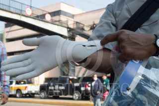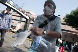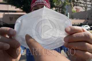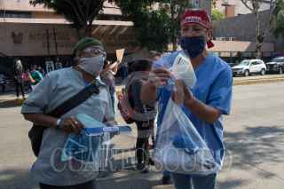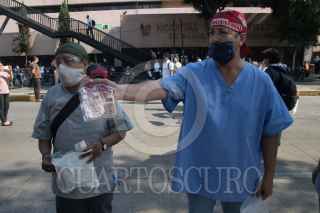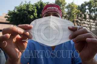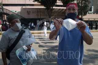 CIUDAD DE MÉXICO, 13MAYO2020.- Un par de camilleros del Hospital de Infectología del IMSS en la Raza muestran el material con lo que los dotan para atender a diario a pacientes infectados de Covid-19, ellos señalan que el mismo es de mala calidad y muestran el cubrebocas que esta en el kit, la cual dicen es de uso civil y no de uso médico, ya que tiene orificios lo que la hace vulnerable y los expone al virus. También dicen que solo les dan dos pares de guantes de mala calidad, muchos de ellos se rompen al ponerselos -de hecho durante la demostración uno de ellos se rasgó- señalan que por cada paciente que ellos trasladan deberían tener un par nuevo. Personal médico de esta hospital se manifestó desde temprano bloqueando ambos carriles del Circuito Interior para exigir que los doten del material suficiente y que este sea de calidad, ya que por no tener el equipo adecuado muchos de sus compañeros se han infectado de Covid-19. FOTO: MOISÉS PABLO/CUARTOSCURO.COM