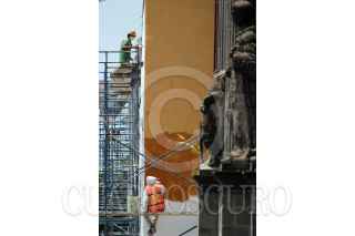 CUERNAVACA, MORELOS, 15MAYO2020.- Dos trabajadores pintan la fachada del Jardín Borda, bajo la mirada eterna de esculturas religiosas de la iglesia de Guadalupe. FOTO: MARGARITO PÉREZ RETANA /CUARTOSCURO.COM