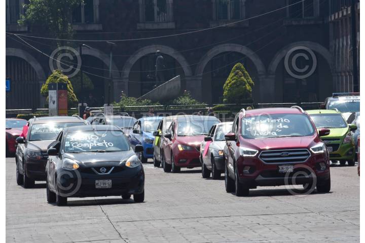 En el marco de la celebración del Día del Maestro, algunos docentes salieron en sus carros a manifestarse y exigir el pago de su bono completo, con cubrebocas, mascarillas y su sana distancia gritaron consignas frente a Palacio de Gobierno. FOTO: CRISANTA ESPINOSA AGUILAR /CUARTOSCURO.COM