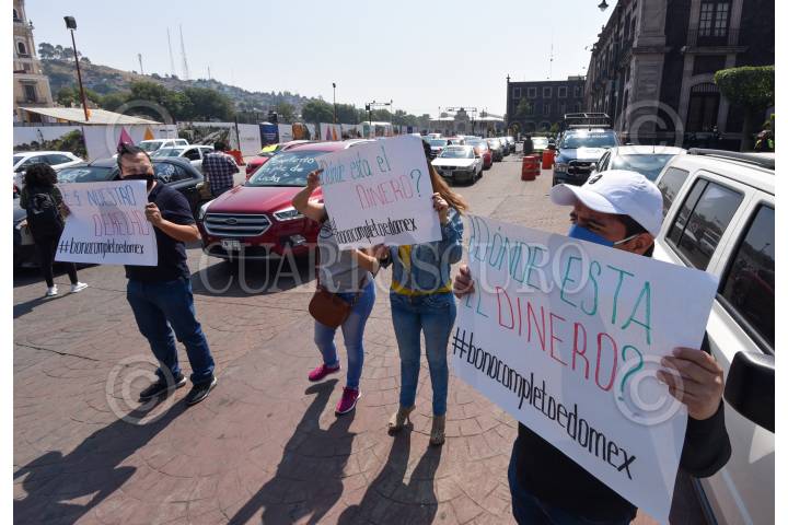 En el marco de la celebración del Día del Maestro, algunos docentes salieron en sus carros a manifestarse y exigir el pago de su bono completo, con cubrebocas, mascarillas y su sana distancia gritaron consignas frente a Palacio de Gobierno. FOTO: CRISANTA ESPINOSA AGUILAR /CUARTOSCURO.COM