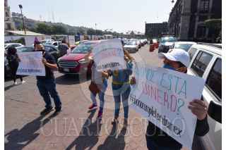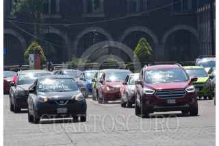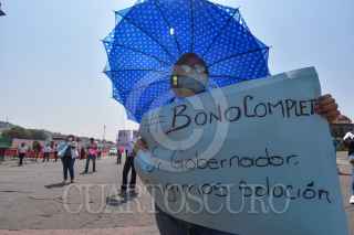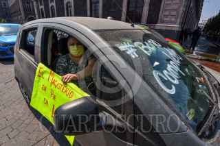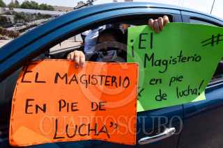 En el marco de la celebración del Día del Maestro, algunos docentes salieron en sus carros a manifestarse y exigir el pago de su bono completo, con cubrebocas, mascarillas y su sana distancia gritaron consignas frente a Palacio de Gobierno. FOTO: CRISANTA ESPINOSA AGUILAR /CUARTOSCURO.COM