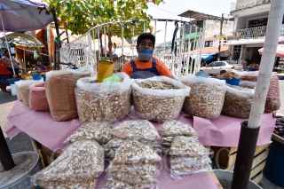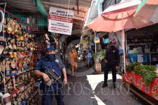 JUAN R. ESCUDERO, GUERRERO, 15MAYO2020.- El mercado de Tierra Colorada, cabecera municipal de Juan R. Escudero en el estado, lugar donde iniciaron los contagios de COVID-19 en el municipio, se encuentra resguardado por policías municipales y con filtros de seguridad donde reparten gel antibacterial a los usuarios, además de que solo se permite el acceso a las personas que usen cubrebocas. FOTO: DASSAEV TÉLLEZ ADAME /CUARTOSCURO.COM