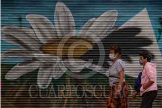 CIUDAD DE MÉXICO, 16MAYO2020.- Dos mujeres de tercera edad caminan por las calles del Centro Histórico donde se pueden apreciar las intervenciones de distintos artistas en las cortinas de locales cerrados por medidas de prevención y expansión del virus COVID-19. FOTO: ANDREA MURCIA/CUARTOSCURO.COM