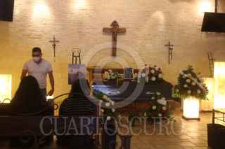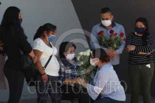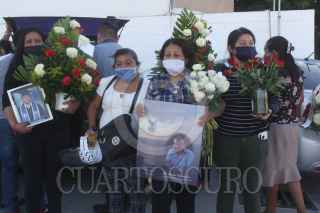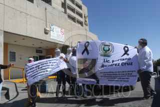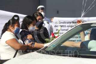CIUDAD JUÁREZ, CHIHUAHUA, 16MAYO2020.- Mariano Ramírez Cruz era enfermero en el IMSS número 35 y perdió la vida el viernes por la mañana por Covid-19. Compañeros de Mariano organizaron una caravana desde el IMSS 35 hasta la funeraria Perches de avenida López Mateos. En el lugar, rindieron homenaje al enfermero en presencia de familiares y amigos para darle el último adiós. “El Sindicato Nacional Democrático del IMSS exige equipo de protección personal, diagnóstico oportuno y tratamiento completo para todos los trabajadores de la salud que enfrentan en esta pandemia”, escribieron en una pancarta durante el homenaje. FOTO: NACHO RUIZ /CUARTOSCURO.COM