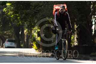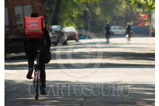 CIUDAD DE MÉXICO, 17MAYO2020.- "Llega un punto que tienes que volver a salir para poder seguir con tus ingresos, y poder vivir": así lo explica Adolfo de 26 años de edad, quien trabaja como repartidor de alimentos en bicicleta desde hace dos años. Ante la falta de herramientas académicas y oportunidades laborales, Adolfo decidió trabajar como repartidor de alimentos de tiempo completo; de lunes a domingo recorre 17 kilómetros en su bicicleta, desde Ecatepec de Morelos hasta su zona de trabajo, la cual puede ser Polanco, Insurgentes o la colonia Condesa. Ante la fase tres de COVID-19, Adolfo ha tenido que tomar sus medidas para evitar contraer el virus; al día realiza en promedio diez pedidos, siempre portando sus goggles y usando gel antibacterial. "La bicicleta me gusta mucho, me devolvió salud y una economía un poco estable" aseguró Adolfo. Mientras tanto, ante la pandemia de COVID-19 en el país, cientos de repartidores de comida como Adolfo, se han visto obligados a seguir trabajando, ya que debido a su situación laboral informal, no pueden seguir las medidas de prevención anunciadas por el Gobierno, y mucho menos cuentan con seguridad social que les permita recibir atención médica para hacer frente a un contagio por COVID-19. FOTO: MAGDALENA MONTIEL /CUARTOSCURO.COM
