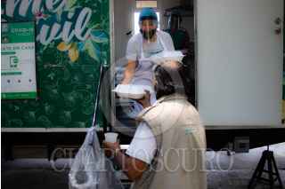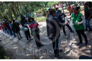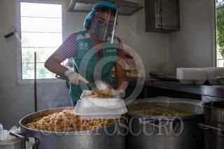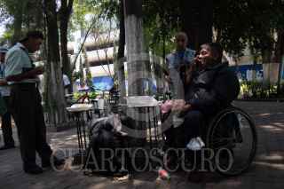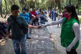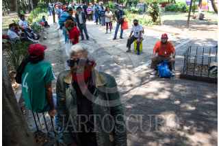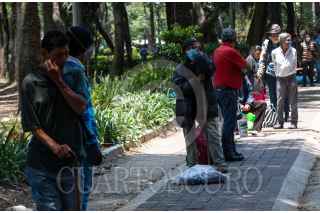 CIUDAD DE MÉXICO, 20MAYO2020.- Trabajadores de la Secretaría de Desarrollo Social de la Ciudad de México se encargan de repartir raciones de comida a personas en situación vulnerable y familiares de pacientes que se encuentran esperando afuera de los hospitales, dede casi el medio día las personas se forman en las cabinas en donde se esperan a que se sirvan las charolas. La imagen corresponde al Jardín López Velarde que se ubica frente al Centro México Siglo XXI. FOTO: MOISÉS PABLO/CUARTOSCURO.COM