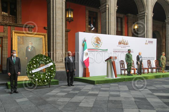 CIUDAD DE MÉXICO, 21MAYO2020.- Andrés Manuel López Obrador, Presidente de México, encabezó la ceremonia conmemorativa del aniversario luctuoso de ex Presidente Venustiano Carranza, en Palacio Nacional. Lo acompañaron Miguel Riquelme Solís, gobernador de Coahuila; Olga Sánchez Cordero, secretaria de Gobernación; y Felipe Arturo Ávila Espinosa, director del Instituto Nacional de Estudios Históricos de las Revoluciones de México. FOTO: PRESIDENCIA/CUARTOSCURO.COM
