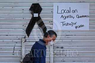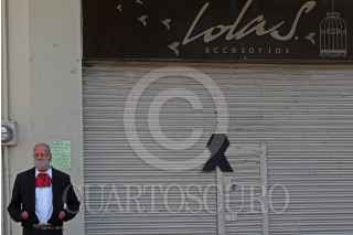 GUADALAJARA, JALISCO, 21MAYO2020.- Locatarios de negocios de la zona comercial de Obregón colocaron 20 moños negros haciendo alusión al numero de comercios que se encuentran por quebrar o bien casi muertos, mencionaron los comerciantes del corredor comercial, esto a causa de la pandemia sanitaria del coronavirus (Covid-19). FOTO: FERNANDO CARRANZA GARCIA / CUARTOSCURO.COM
