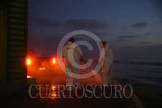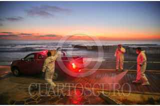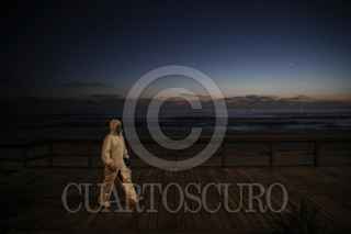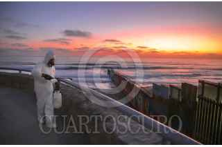 TIJUANA, BAJA CALIFORNIA, 22MAYO2020.- Ciudadanos continúan con labores de apoyo en la sanitización de lugares públicos que pudieran ser un foco de infección de Covid-19. Los autodenominaros 'Covid Busters’, un grupo de amigos que dejaron del lado sus profesiones para apoyar a la ciudad, desinfectaron el malecón de Playas de Tijuana, utilizando trajes especiales de protección y maquinas de presión. El inicio del trabajo se realizó a un costado del muro fronterizo entre México y Estados Unidos. FOTO: OMAR MARTÍNEZ /CUARTOSCURO.COM