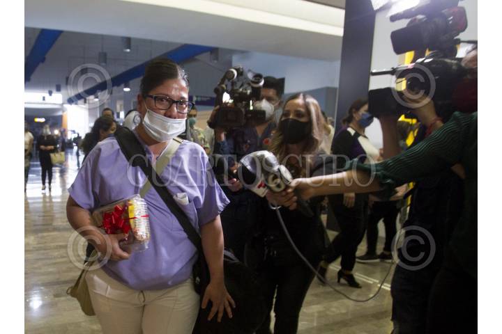 MONTERREY, NUEVO LEÓN, 22MAYO2020.- Un grupo de 14 enfermeros y enfermeras de Monterrey que viajaron a la ciudad de México con la finalidad de ayudar en hospitales del IMSS y fueron secuestrados en el hotel donde se hospedaban el pasado 19 de mayo arribaron al Aeropuerto Internacional de Monterrey FOTO: GABRIELA PÉREZ MONTIEL / CUARTOSCURO.COM