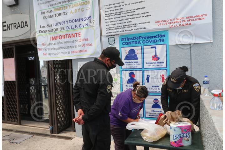 CIUDAD DE MÉXICO, 24MAYO2020.- Elementos de seguridad y personal médico utilizaron medidas sanitarias a los familiares que acudieron a visitar a los internos en las inmediaciones del Penal Femenil y Varonil Santa Martha Acatitla. El día de ayer el Penal Femenil reportó el contagio de 19 internas de Covid-19, reveló que dentro de la supervisión en los espacios de aislamiento por sospecha de COVID-19, el grueso de los casos son reclusos de nuevo ingreso quienes más presentan síntomas y se indicó que nuevos reclusos se mantendrán en aislamiento durante al menos 14 días y no podrán ser visitados. FOTO: GRACIELA LÓPEZ /CUARTOSCURO.COM