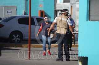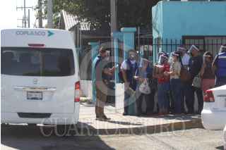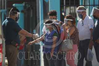 CIUDAD JUÁREZ, CHIHUAHUA, 28MAYO2020.- Las medidas de seguridad inician desde el transporte de personal que viaja a menos del 50 por ciento de su capacidad para guardar la sana distancia. Una vez que los empleados llegan a la planta maquiladora pasan por una revisión primaria en donde se les mide la temperatura. Después pasan otro filtro de sanitización y uso de gel antibacterial, pisan en tapetes sanitizantes y finalmente pueden llegar a su área de trabajo. FOTO: NACHO RUIZ /CUARTOSCURO.COM