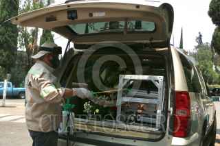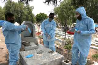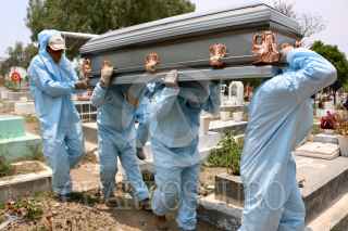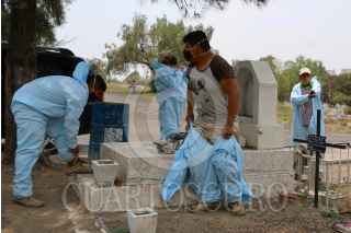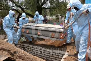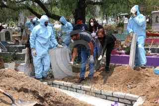 CIUDAD DE MÉXICO, 28MAYO2020.- Sepultureros del Panteón Civil de San Nicolás Tolentino, llevan a cabo la inhumación de un cuerpo contagiado por COVID-19. Con una cantidad restringida de familiares al sepelio. ADRIANA ÁLVAREZ /CUARTOSCURO.COM