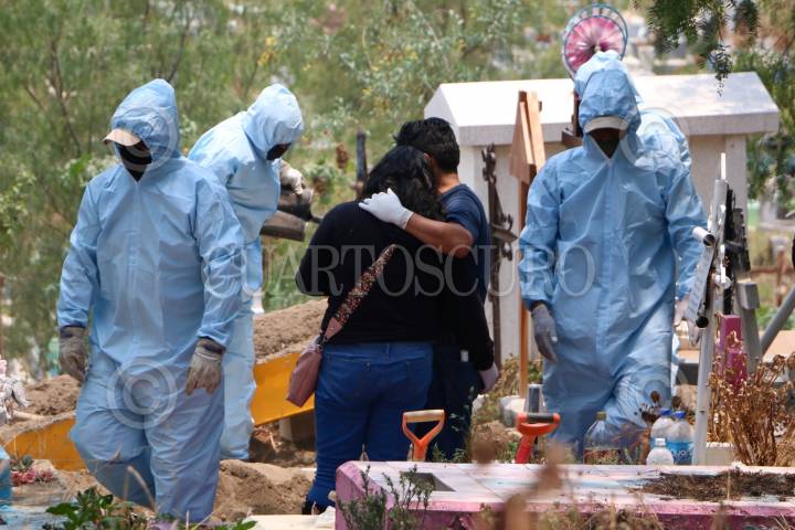 CIUDAD DE MÉXICO, 28MAYO2020.- Sepultureros del Panteón Civil de San Nicolás Tolentino, llevan a cabo la inhumación de un cuerpo contagiado por COVID-19. Con una cantidad restringida de familiares al sepelio. ADRIANA ÁLVAREZ /CUARTOSCURO.COM