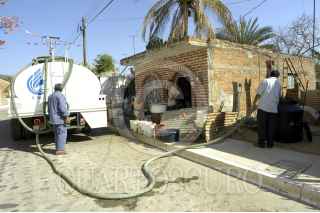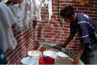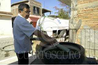 ECATEPEC, ESTADO DE MEXICO 14MARZO2006.- Debido a la escasez de agua, los habitantes tienen que comprar el vital lìquido. Una empleado descarga el agua en cubetas. FOTO: Guillermo Perea / CUARTOSCURO.COM