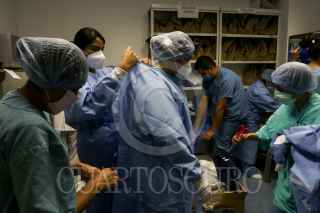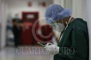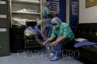CIUDAD DE MÉXICO, 29MAYO2020.- La preparación se ha vuelto dogmáticamente, dos pares de guantes; cofia y protector de pies. Una bata nueva por cada ingreso, un cubrebocas N95, los googles se pueden lavar. Una vez adentro no hay manera de salir hasta que acabe el turno. El personal del área de terapia intensiva para pacientes Covid-19 del Hospital Juárez de México continúa sus labores durante el pico de la pandemia por Sars-CoV-2 en el territorio nacional, padecimiento que ha cobrado la vida de 9044 personas y contagiado más de 81 mil. El gobierno federal ha anunciado que a partir del 01 de junio comenzará el retorno a la “nueva normalidad”, estrategia que plantea la reanudación de ciertas actividades con el fin de evitar el rezago económico en la capital. El nosocomio opera actualmente al máximo el área Covid-19, sin disponibilidad de camas. FOTO: GALO CAÑAS /CUARTOSCURO.COM