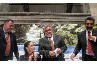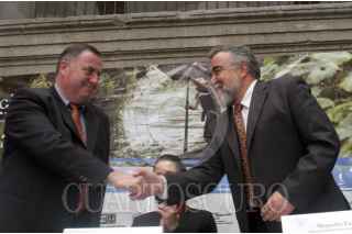 MEXICO, D.F. 14MARZO2006.- Loic Fauchon, presidente del Consejo Mundial del Agua, Claudia Sheimbaum, secretaria de medio ambiente del D.F., Alejandro Encinas, jefe de gobierno de la ciudad de México y Enrique Villa Rivera, director general del Politécnico previo a la inauguración del Encuentro Internacional de Experiencias por el Agua, que se lleva a cabo en el palacio de Mineria. FOTO: Nelly Salas/CUARTOSCURO.COM