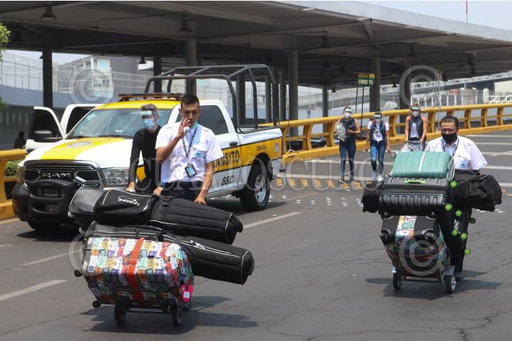 CIUDAD DE MÉXICO, 01JUNIO2020.- Elementos de la Policía resguardaron el puente de la avenida Capitán Carlos León, de la Terminal 1 del Aeropuerto Internacional de la Ciudad de México (AICM) debido al bloqueo de los sindicalizados de Aeropuerto. Los pasajeros llegan a las instalaciones caminando o en vehículos de servicio del AICM. FOTO: GRACIELA LÓPEZ /CUARTOSCURO.COM