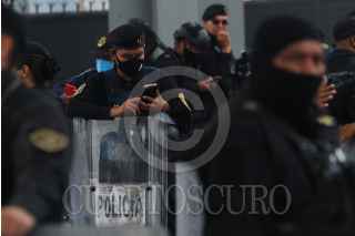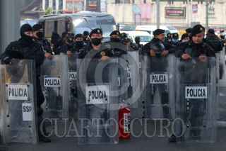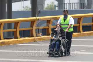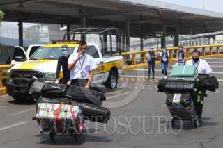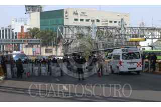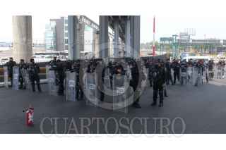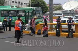CIUDAD DE MÉXICO, 01JUNIO2020.- Elementos de la Policía resguardaron el puente de la avenida Capitán Carlos León, de la Terminal 1 del Aeropuerto Internacional de la Ciudad de México (AICM) debido al bloqueo de los sindicalizados de Aeropuerto. Los pasajeros llegan a las instalaciones caminando o en vehículos de servicio del AICM. FOTO: GRACIELA LÓPEZ /CUARTOSCURO.COM