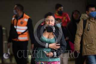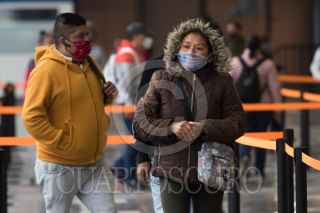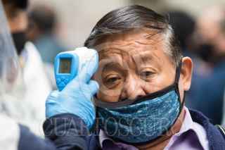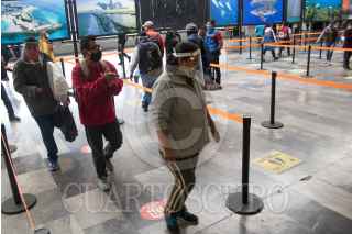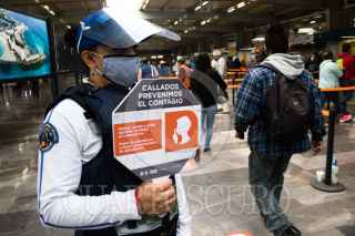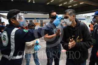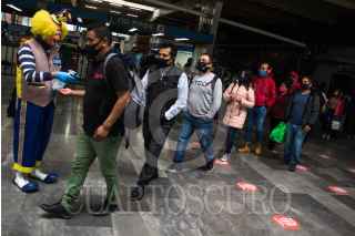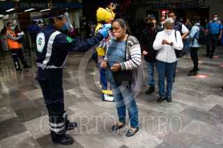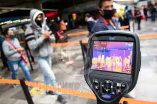 CIUDAD DE MÉXICO, 01JUNIO2020.- Se estima que hoy aumento en un millón de pasajeros el flujo de pasajeros tras la reactivación de varios sectores productivos como la industria automotriz, la construcción, y sector industrial, esto tras casi de dos meses de cuarentena por la pandemia de Covid-19, para evitar que el virus se siga propagando autoridades del metro han montado operativos en estaciones de mayor afluencia para informar a la población de las medidas sanitarias que deben cumplir durante su estancia en el metro, como el uso de cubrebocas de manera obligatoria, además de guardar sana distancia. En la imagen al entrar los usuarios se les proporciona gel antibacterial, se les mide la temperatura y con una cámara térmica se observa a personas que pudieran tener la temperatura alta. FOTO: MOISÉS PABLO/CUARTOSCURO.COM