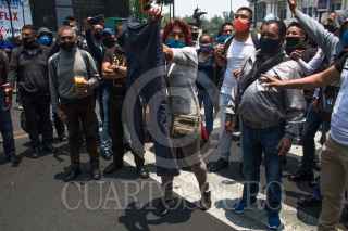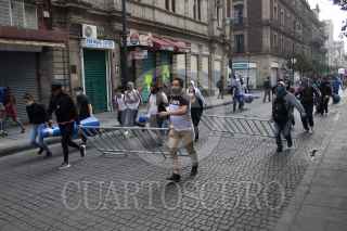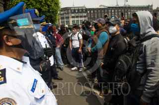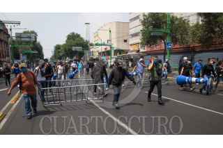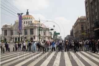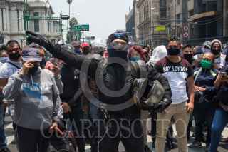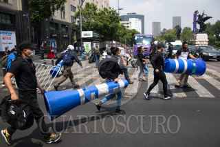 CIUDAD DE MÉXICO, 01JUNIO2020.- Policías capitalinos iniciaron una manifestación en las inmediaciones del Antiguo Palacio del Ayuntamiento para exigir al gobierno capitalino el pago de sus bonos, que les fueron prometidos por la pandemia de Covid-19, los cuales señalan los inconformes no han llegado en sus pagos, tras una hora de negociación la comisión salió y les informaron que el pago de dicho bono sería en esta próxima quincena, pero no estuvieron de acuerdo por que ellos exigien el pago retroactivo de dichos bonos. Como una medida de presión los policías tomaron rejas e inmobiliario que es utilizado en el transito y se trasladaron al Eje Central, por la calle de Venustiano Carranza, ahí bloquearon Eje Central y Avenida Juárez. Durante la manifestación también develaron actos de corrupción e intimidación de los altos de la Secretaría de Seguridad Ciudadana. FOTO: MOISÉS PABLO/CUARTOSCURO.COM