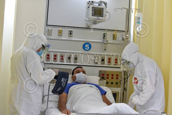 Simulación de atención a un paciente con COVID-19 en la Unidad de Terapia Intensiva del Hospital Militar de la 22 Zona Militar en Santa María Rayón, en donde tendrán contacto con sus familiares a través de video llamadas, y la cual inició operaciones a finales del mes de Mayo después de realizarse su reacondicionamiento. FOTO: CRISANTA ESPINOSA AGUILAR /CUARTOSCURO.COM