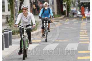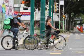CIUDAD DE MEXICO, 03JUNIO2020.- Para evitar aglomeraciones y posibles contagios por COVID-19 en el transporte público, principalmente en el metro y metrobús, autoridades de la ciudad han instalado ciclovías provisionales en las avenidas como Insurgentes. Así mismo policías de tránsito vigilan que se respete en todo momento el carril confinado para ciclistas. Esto en el marco de la celebración del Día Mundial de la Bicicleta. ROGELIO MORALES /CUARTOSCURO.COM