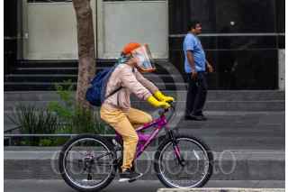 CIUDAD DE MÉXICO, 03JUNIO2020.- Ciclista se transporta por la ciclovía de Av. Juárez; porta cubrebocas, careta y guantes como medida de prevención de COVID-19. Hoy es el día Mundial de la Bicicleta. FOTO: ANDREA MURCIA/CUARTOSCURO.COM