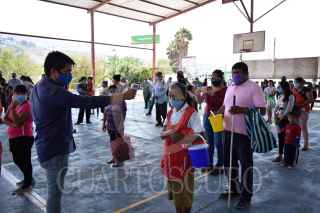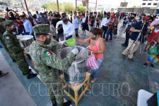 CHILPANCINGO, GUERRERO, 04JUNIO2020.- La Secretaría de la Defensa Nacional (SEDENA) a través de la 35va. Zona Militar de Chilpancingo instaló dos comedores comunitarios (uno en la colonia Galeana y otro más en la Rosario Ibarra) donde diariamente se repartirán mil 200 raciones de comidas en un horario de 11:00 a 14:00. La iniciativa, que también será a nivel nacional, es para apoyar a las familias afectadas por la contingencia sanitaria que existe por el COVID-19, por lo que se les pidió a los beneficiarios acudir sin niños y con cubrebocas, además de que para poder recibir este apoyo se les toma la temperatura para descartar alguna persona enferma y evitar algún contagio. FOTO: DASSAEV TÉLLEZ ADAME /CUARTOSCURO.COM