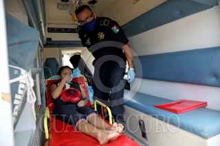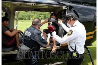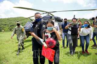 TEKAX, YUCATÁN, 06JUNIO2020.- Un helicóptero de la Secretaria de Seguridad Publica que funciona como puente aéreo rescato de la comisaria San Isidro Yaxché, uno de los más afectados por la tormenta Cristóbal, a una mujer embarazada para que reciba atención medica inmediata en el Hospital General. FOTO: FRANCISCO BALDERAS /CUARTOSCURO.COM