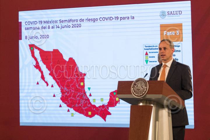CIUDAD DE MÉXICO, 08JUNIO2020. - Andrés Manuel López Obrador, Presidente de México, encabezó este martes la conferencia matutina en Palacio Nacional. Lo acompañaron Marcelo Ebrard Casaubón, secretario Relaciones Exteriores; Jorge Alcocer Varela, secretario de Salud, y Hugo López-Gatell, subsecretario de Salud. FOTO: MOISÉS PABLO/CUARTOSCURO.COM