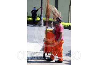 CUERNAVACA, MORELOS, 09JUNIO2020.- Un trabajador de limpieza de las calles se toma un descanso para escuchar el discurso de unos presidentes municipales en la plaza de armas de la capital. FOTO: MARGARITO PÉREZ RETANA /CUARTOSCURO.COM