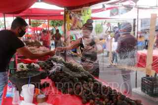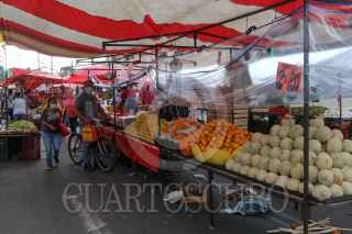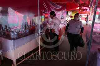 CIUDAD DE MÉXICO , 09JUNIO2020.- Dentro de los protocolos utilizados en la "Nueva Normalidad", comerciantes utilizan en su mayoría medidas sanitarias como el hule cristal para no tener contacto directo con los clientes, uso de cubrebocas y gel antibacterial para evitar la propagación del contagio del Covid-19. Los únicos puestos que se pueden instalar en un tianguis en la alcaldía Iztapalapa son de canasta básica. El horario del tianguis es de 8:00 a 17:00 horas aproximadamente, mismo que han llevado a cabo antes de la contingencia sanitaria por el Coronavirus. FOTO: GRACIELA LÓPEZ /CUARTOSCURO.COM