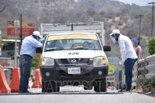 EDUARDO NERI, GUERRERO, 09JUNIO2020.- Trabajadores del ayuntamiento de Eduardo Neri, de las áreas de seguridad pública y salud, instalaron, desde hace un mes, filtros de revisión y sanitización para descartar el ingreso de personas contagiadas de COVID-19 a la cabecera municipal, Zumpango del Río. En dicho filtro, se toma la temperatura y se brinda gel antibacterial , posteriormente sanitizan los vehículos. Explicaron que, en caso de detectar una persona con una temperatura de 38 grados, se le pide reposar un momento para descartar que tenga fiebre, dado que la exposición al sol eleva ligeramente la temperatura y, en caso de continuar con la temperatura elevada, se le invita a hacerse las pruebas correspondientes, llamar a la línea de emergencia "COVITEL" y se aísle por 15 días, respetando las medidas sanitarias correspondientes. FOTO: DASSAEV TÉLLEZ ADAME/CUARTOSCURO.COM