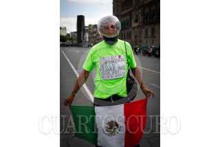 CIUDAD DE MÉXICO, 11JUNIO2020.- Un hombre auto nombrado como “Basurin Juanito” porta un envase de garrafón de agua como protección para prevenir el contagio de COVID-19 mientras camina por las calles del Centro Histórico con una bandera de México apoyando el labor del personal médico, de limpieza, policías y Guardia Nacional. FOTO: ANDREA MURCIA/CUARTOSCURO.COM