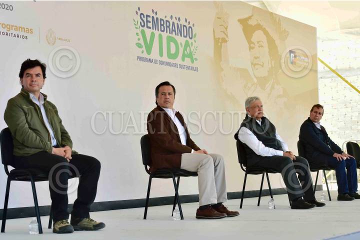 PEROTE, VERACRUZ. 15JUNIO2020. Andrés Manuel López Obrador, Presidente Constitucional de los Estados Unidos Mexicanos presentó los avances del programa "Sembrando Vida". Lo acompañan Cuitláhuac García Jiménez, Gobernador Constitucional del Estado de Veracruz; María Luisa Albores González, Secretaria de Bienestar; Javier May Rodríguez, Subsecretario de Evaluación, Planeación y Desarrollo Regional y Juan Francisco Hervert Prado, Presidente Municipal de Perote, Veracruz. FOTO: PRESIENCIA/CUARTOSCURO.COM