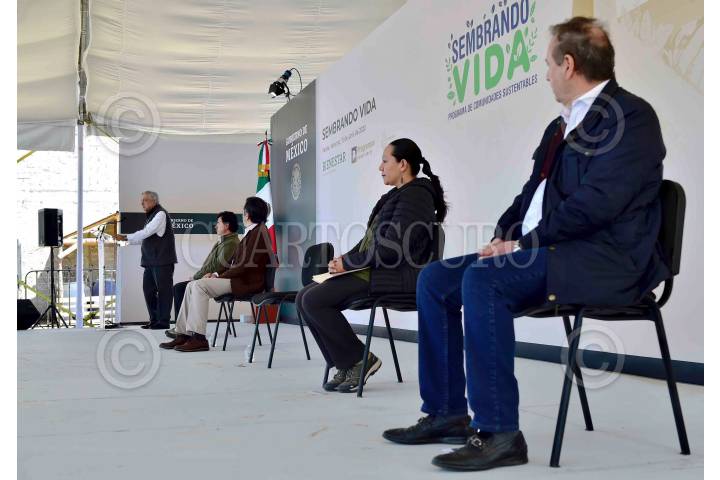 PEROTE, VERACRUZ. 15JUNIO2020. Andrés Manuel López Obrador, Presidente Constitucional de los Estados Unidos Mexicanos presentó los avances del programa "Sembrando Vida". Lo acompañan Cuitláhuac García Jiménez, Gobernador Constitucional del Estado de Veracruz; María Luisa Albores González, Secretaria de Bienestar; Javier May Rodríguez, Subsecretario de Evaluación, Planeación y Desarrollo Regional y Juan Francisco Hervert Prado, Presidente Municipal de Perote, Veracruz. FOTO: PRESIENCIA/CUARTOSCURO.COM