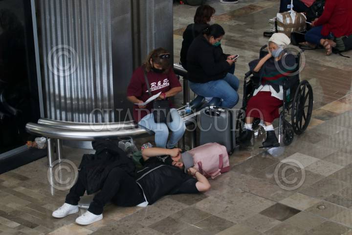 CIUDAD DE MÉXICO, 15JUNIO2020.- Como medidas de prevención ante el contagio del Covid-19, continúan tomando temperatura, el uso de cubrebocas y la instalación de unifilas en diferentes Aerolíneas del Aeropuerto Internacional de la Ciudad de México (AICM). Los pasajeros relajan la sana distancia mientras esperan su turno de ingresar a su vuelo. FOTO: GRACIELA LÓPEZ /CUARTOSCURO.COM