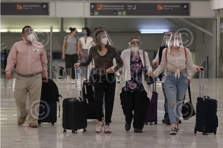 CIUDAD DE MÉXICO, 15JUNIO2020.- Como medidas de prevención ante el contagio del Covid-19, continúan tomando temperatura, el uso de cubrebocas y la instalación de unifilas en diferentes Aerolíneas del Aeropuerto Internacional de la Ciudad de México (AICM). Los pasajeros relajan la sana distancia mientras esperan su turno de ingresar a su vuelo. FOTO: GRACIELA LÓPEZ /CUARTOSCURO.COM