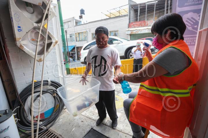 Mercados de la ciudad de Toluca han implementado medidas sanitarias para permitir el acceso a los clientes a realizar sus compras, como la toma de temperatura corporal y gel antibacterial, y en los negocios se instalaron plásticos como barrera entre los clientes, productos y vendedores, para garantizar la salud de locatarios y consumidores ante la contingencia por COVID-19. FOTO: CRISANTA ESPINOSA AGUILAR /CUARTOSCURO.COM