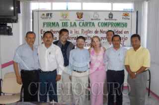 CHILPANCINGO, GUERRERO 16MARZO2006.- Virgilio Andrade Martinez consejero electoral federal del IFE y Leonor Velez Calvo consejera presidenta del distrito 07 del IFE, acompañados de los alcaldes de los municipios que conforman el distrito 07, posan para la foto del recuerdo, al tèrmino de la firma de la carta compromiso en Adherencia a las Reglas de Neutralidad en Materia Electoral emitidas por el Consejo General del Instituto Federal Electoral, para el pròximo proceso federal. FOTO: Oscar Alvarado/CUARTOSCURO.COM