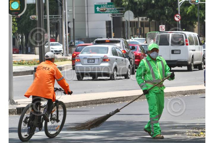 CIUDAD DE MEXICO, 18JUNIO2020.- Trabajadores de limpieza de la ciudad continúan laborando, con mínima protección que implica el uso de cubrebocas, de la misma forma por momentos los empleados se olvidan de la sana distancia, esto frente a la pandemia por COVID-19 que afecta a nuestro país. Según cifras del Sindicato Único de Trabajadores de la Ciudad de México (SUTGCDMX), hasta el momento se estima que cerca de de un centenar de empleados han perdido la vida a causa del coronavirus. FOTO: ROGELIO MORALES /CUARTOSCURO.COM