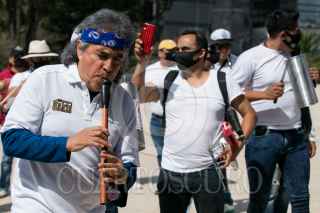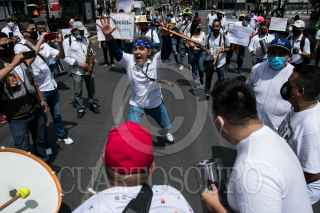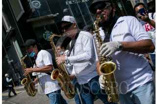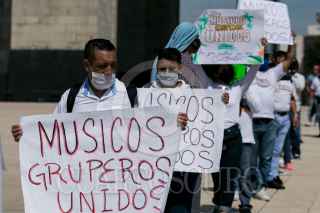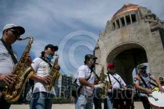 CIUDAD DE MÉXICO, 19JUNIO2020.- Músicos Grupos Unidos se manifestaron marchando y tocando desde el Monumento a la Revolución hasta el Zócalo Capitalino para exigir al presidente Andrés Manuel López Obrador que reabra los lugares de empleo como restaurantes, salón de fiesta o baile ya que los apoyos prometidos, debido a la pandemia por Covid-19, les resultan insuficientes para subsistir. FOTO: GALO CAÑAS /CUARTOSCURO.COM