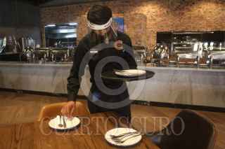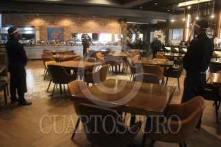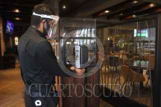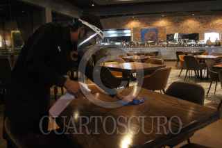 CIUDAD JUÁREZ, CHIHUAHUA, 22JUNIO2020.- Inician restauranteros aforo en código naranja la cual sigue las siguientes medidas sanitarias: contar con al menos un dispensador de gel antibacterial en la entrada del local; disminuir el aforo, cumpliendo con el porcentaje de comensales según el semáforo con base en la placa del aforo autorizado, así como la distancia entre las mesas de por lo menos 1.5 metros; no aceptar reuniones de grupo, ni juntar mesas, ni grupos musicales; limpiar las mesas, sillas y bandejas después de cada uso del cliente; eliminar las estaciones y máquinas de autoservicio, para evitar las filas, el contacto cercano y la manipulación de los utensilios para servirla; retirar los productos de autoservicio: aceiteros, servilleteros, botellas de cátsup, azúcar, vinagre, sal, pimienta, y reemplázalas con bolsitas o contenedores de un solo uso, para minimizar las superficies que se tocan con frecuencia, y fomentar el pago con tarjeta para reducción de manipulación de dinero en efectivo. La mesa se montará enfrente del cliente para evitar el tiempo de exposición de cubiertos y platos, antes de ser utilizados. FOTO: NACHO RUIZ/CUARTOSCURO.COM -Envases para condimentos, salsas y extras deberán ser servidos al momento, y en porciones individuales. -Los menús deberán estar impresos en material que pueda ser sanitizado antes y después de cada uso. -Se recomienda no usar de manteles. En caso de usarlo reemplazarlo entre cada cliente, introducirlo en una bolsa y cerrarla evitando sacudirlo, también el lavarse las manos antes y después de retirarlo. El lavado del mantel debe hacerse a temperatura de 60°C en forma mecánica.