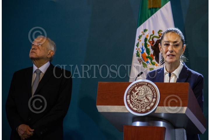 CIUDAD DE MÉXICO, 24JUNIO2020.- Andrés Manuel López Obrador, presidente de México acompañado de Claudia Sheinbaum Pardo, jefa de Gobierno de la Ciudad; Olga Sánchez Cordero, secretaria de Gobernación; Alfonso Durazo, secretario de Seguridad Pública; Luis Cresencio Sandoval, secretario de la Defensa Nacional; José Rafael Ojeda, secretario de Marina encabezaron por primera vez conferencia de prensa matutina en el Antiguo Palacio de Ayuntamiento. FOTO: ANDREA MURCIA/CUARTOSCURO.COM
