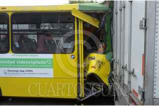 CIUDAD DE MÉXICO, 24JUNIO2020.- Un camión de pasajeron se estrelló contra la caja de un tráiler que estaba estacionada en Avenida Montevideo y Norte 45, en la colonia Industrial Vallejo. Elementos de la Cruz Roja atendieron a cinco personas que resultaron heridas. FOTO: ARMANDO MONROY /CUARTOSCURO.COM