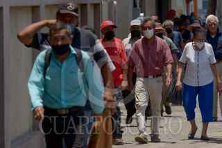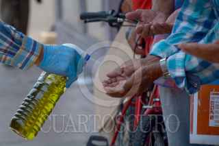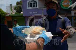 CULIACÁN, SINALOA, 24JUNIO2020.- La Iglesia Del Carmen continúa dando alimento caliente a 300 personas que se quedaron sin trabajo debido a la pandemia ocasionada por el Covid-19. Desde las 11:00 horas, cientos de personas, principalmente adultos mayores que se empleaban en diferentes oficios en la zona centro de la ciudad, hacen fila para recibir un platillo, agua y un pan. FOTO: JUAN CARLOS CRUZ/CUARTOSCURO.COM